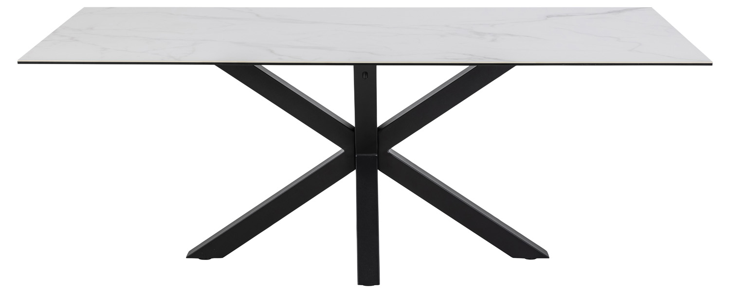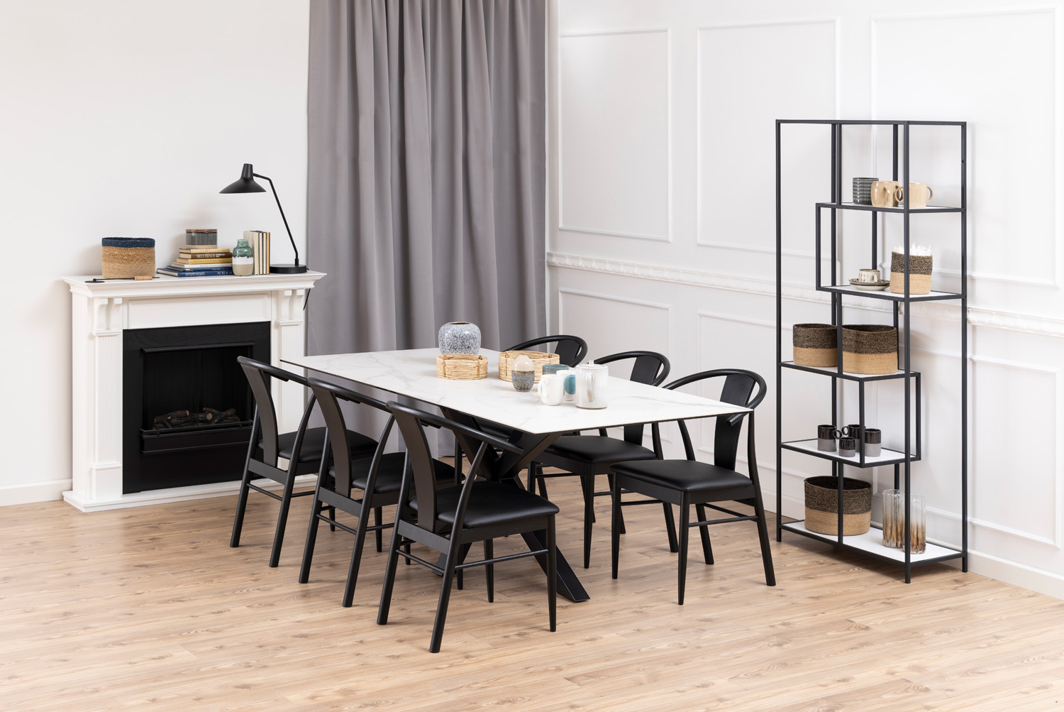 Prie skoningo valgomojo stalo yra pakankamai vietos maloniai pavalgyti. Marmuro išvaizdos stalas atrodo šiuolaikiškai ir yra lengvai prižiūrimas. Karščiui ir įbrėžimams atsparus keramikinis stalviršis ir skulptūriškas kryžminis pagrindas. Dėl šių savybių stalas yra idealus bet kurių namų priedas. PRIEŽIŪRA. Naudokite padėkliukus ir stalo kilimėlius, kad išvengtumėte paviršiaus pažeidimų. Sausai nušluostykite šluoste, kad nerūdytų. Netrinkite paviršiaus kietais daiktais.