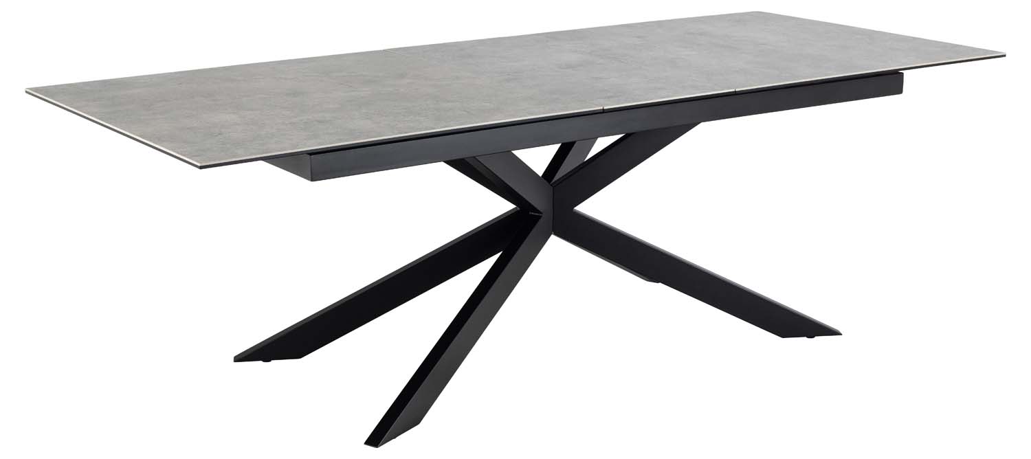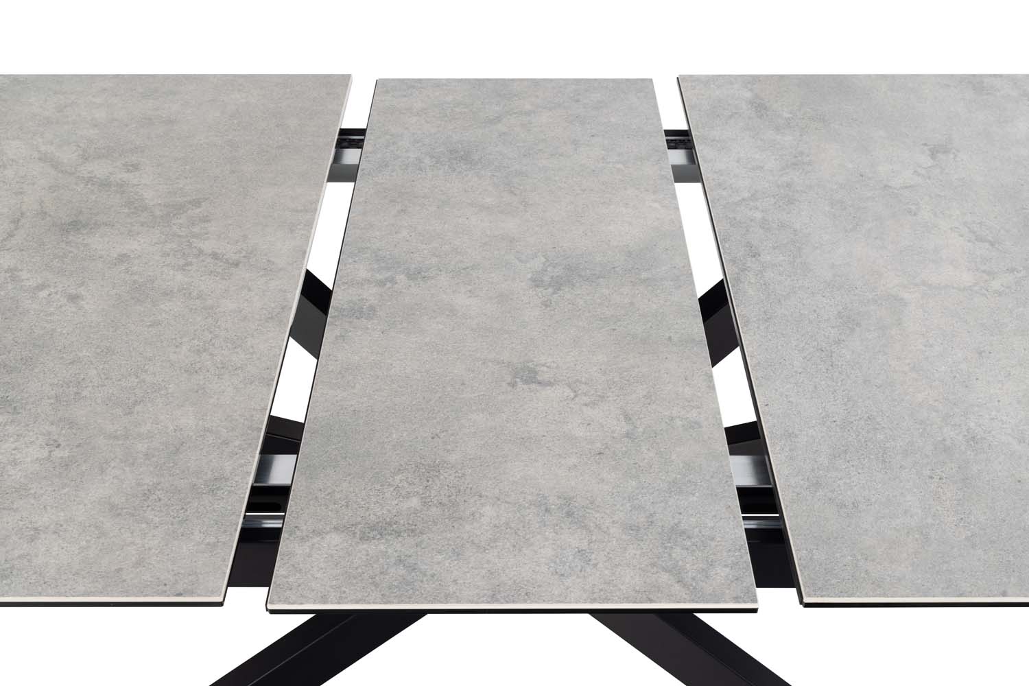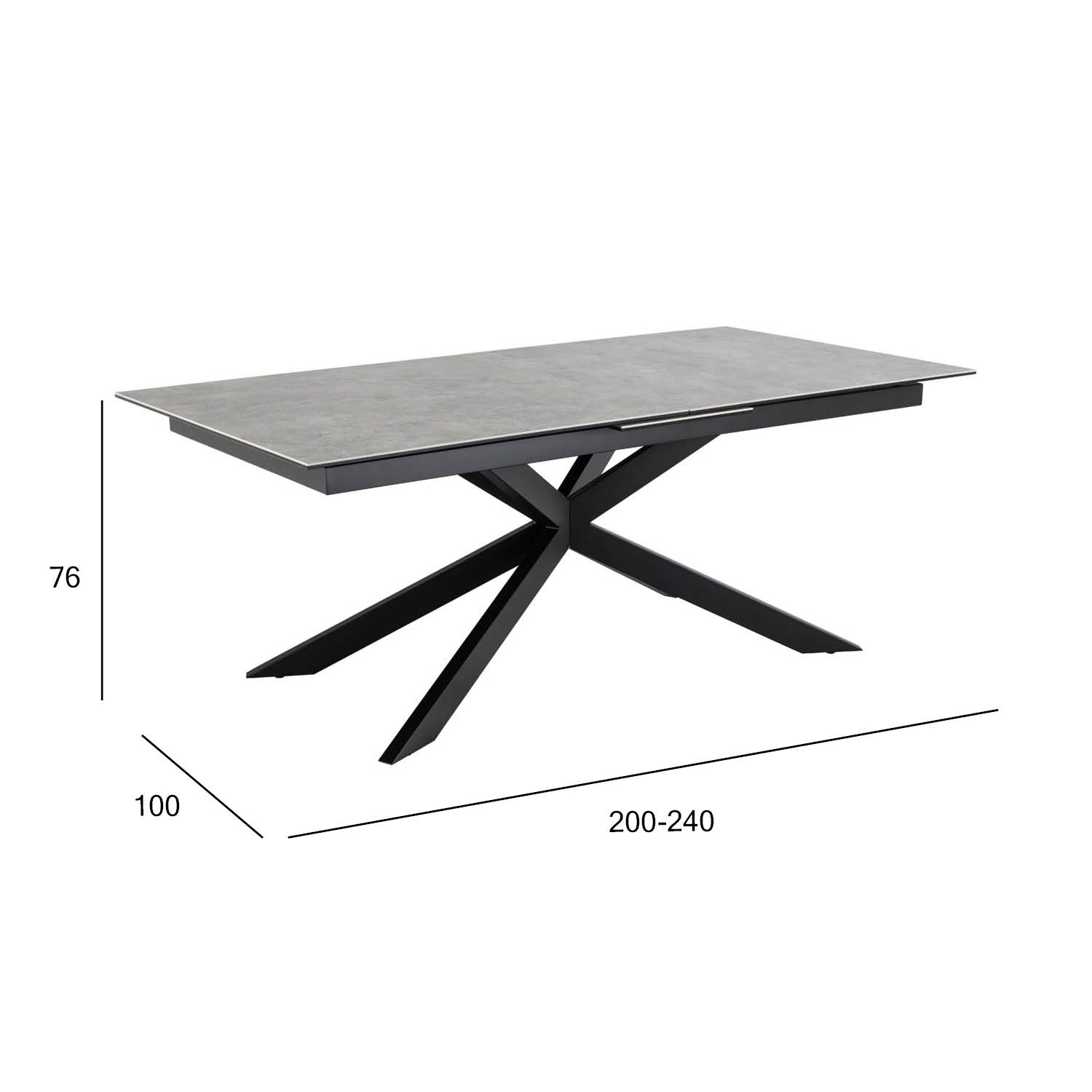 Valgomojo stalo stalviršis yra pilkos spalvos keramikos. Paviršius ne tik gražiai atrodo, bet ir yra atsparus karščiui bei įbrėžimams. Stalą galima lengvai prailginti dėl sinchroninio prailginimo. Tereikia švelniai patraukti stalo galą, ir prailgintuvas atsidurs centre. Stalo juodas plieninis skersinis suteikia kontrasto stalo išvaizdai. Medžiaga: keramika. Kojos: milteliniu būdu dengtas plienas. Gaminio matmenys: 240x100xH76 cm. Keramika: keramika yra karščiui ir įbrėžimams atspari medžiaga, kuriai reikia minimalios priežiūros. Atsiradus dėmėms, paviršių nuvalykite sausa suspausta pluošto šluoste arba popieriniu rankšluosčiu. Kad nepažeistumėte paviršiaus, naudokite stiklo šluostes. Dugnas: kasdieniam valymui naudokite sausai išsuktą muiluotą šluostę. Paviršių nušluostykite sausai, kad nerūdytų. Netrinkite paviršiaus kietais daiktais.