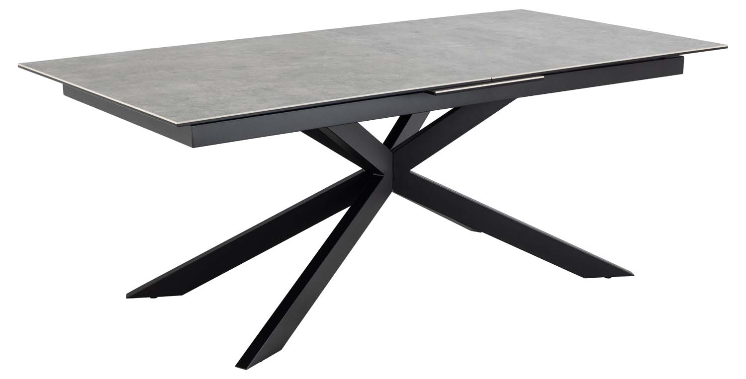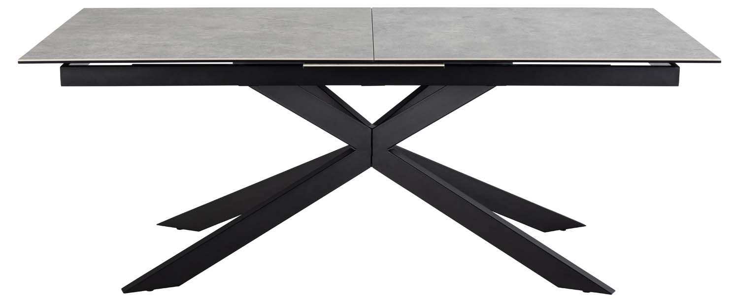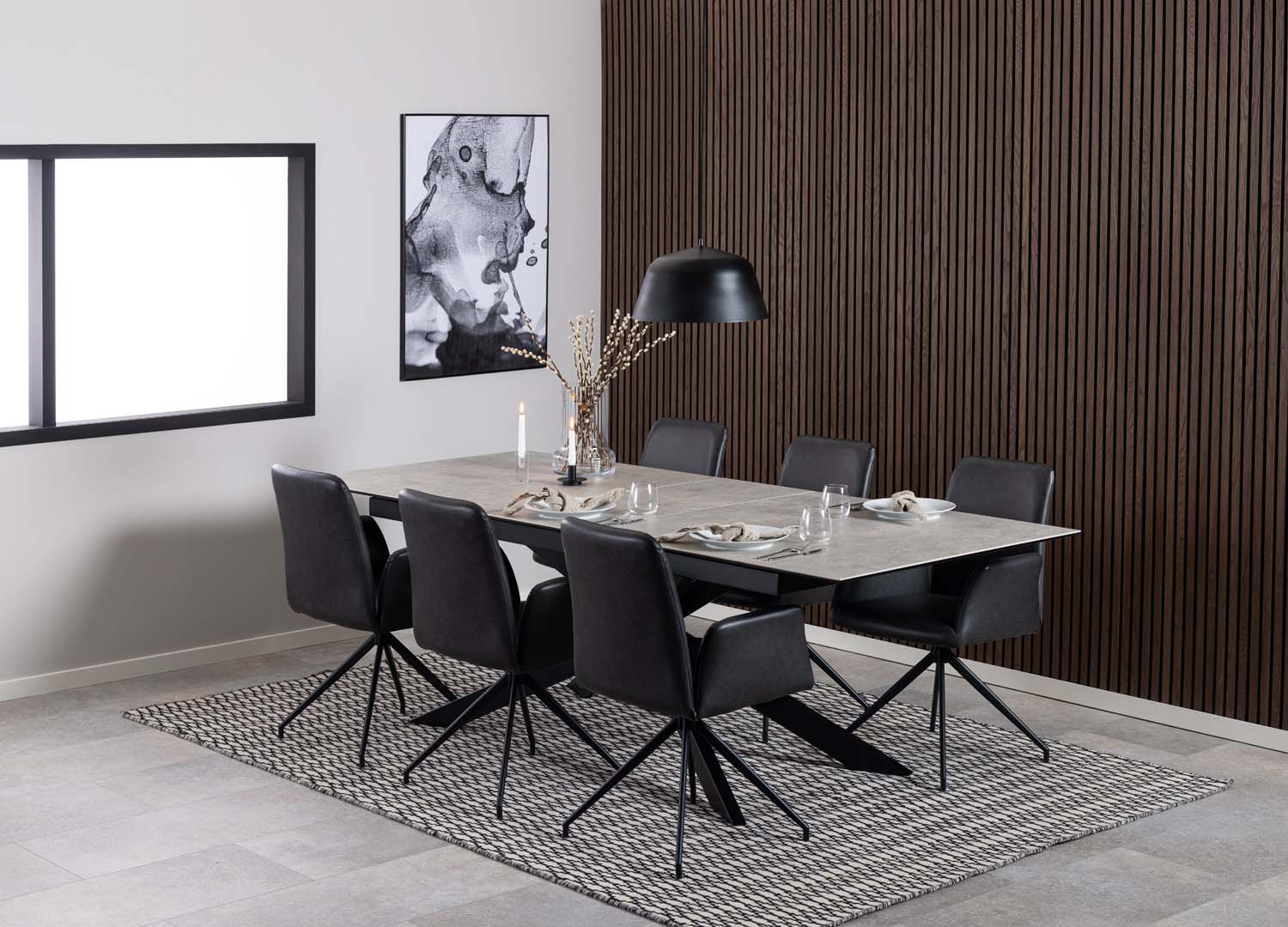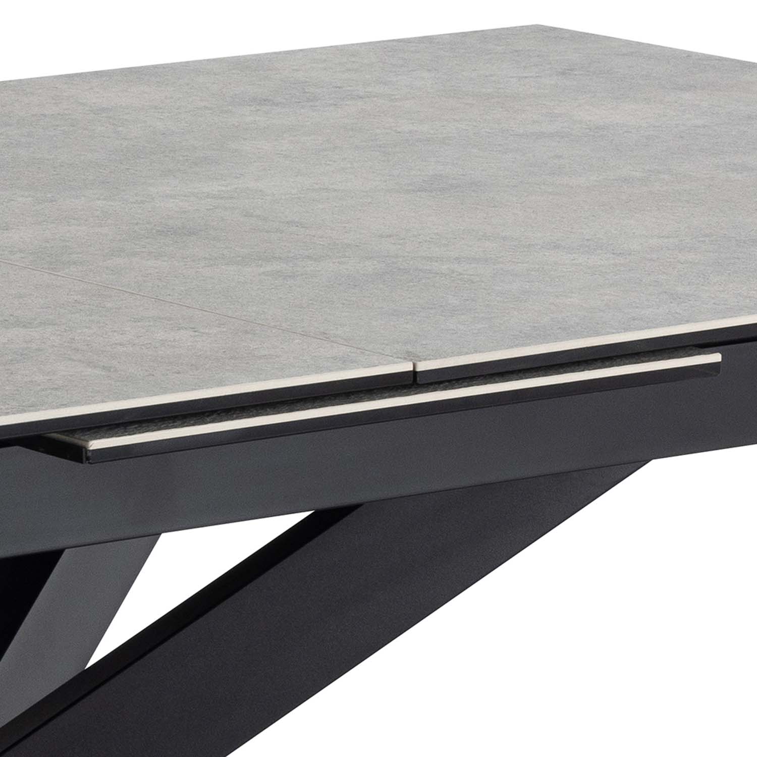 Valgomojo stalo stalviršis yra pilkos spalvos keramikos. Paviršius ne tik gražiai atrodo, bet ir yra atsparus karščiui bei įbrėžimams. Stalą galima lengvai prailginti dėl sinchroninio prailginimo. Tereikia švelniai patraukti stalo galą, ir prailgintuvas atsidurs centre. Stalo juodas plieninis skersinis suteikia kontrasto stalo išvaizdai. Medžiaga: keramika. Kojos: milteliniu būdu dengtas plienas. Gaminio matmenys: 240x100xH76 cm. Keramika: keramika yra karščiui ir įbrėžimams atspari medžiaga, kuriai reikia minimalios priežiūros. Atsiradus dėmėms, paviršių nuvalykite sausa suspausta pluošto šluoste arba popieriniu rankšluosčiu. Kad nepažeistumėte paviršiaus, naudokite stiklo šluostes. Dugnas: kasdieniam valymui naudokite sausai išsuktą muiluotą šluostę. Paviršių nušluostykite sausai, kad nerūdytų. Netrinkite paviršiaus kietais daiktais.