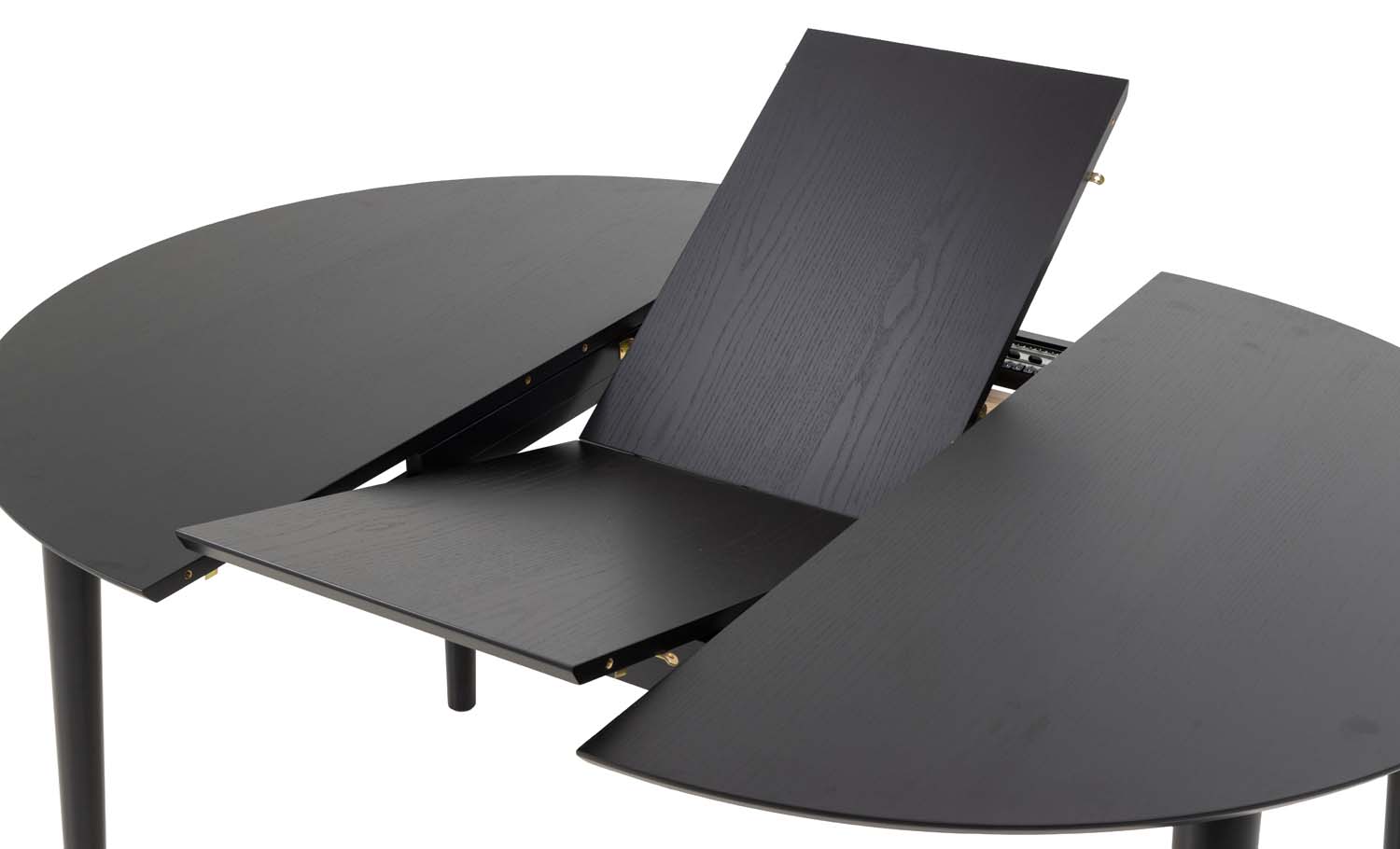 Modernus valgomojo stalas su drugelio formos stalviršiu. Juodai lakuotas ąžuolinis stalviršis. Juodai lakuotas medinis pagrindas. Po stalu įrengta vieta prailginimo plokštei laikyti. Išplėstas patogiai talpina 6 žmones. Gaminio matmenys D115/154xH75 cm.