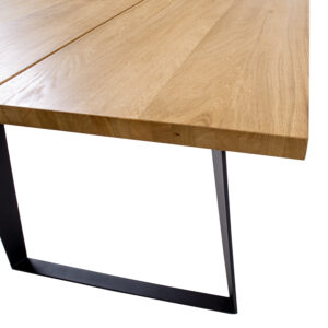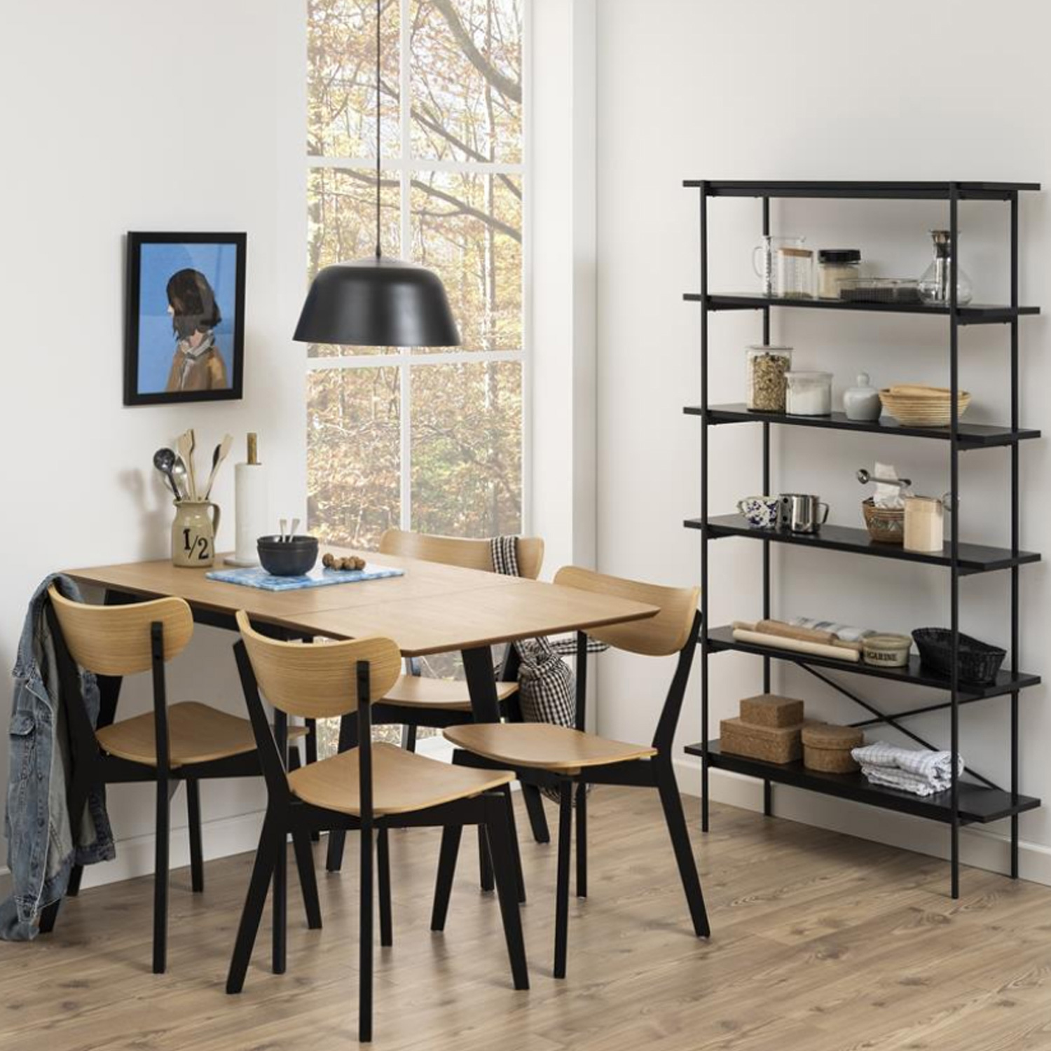 Valgomojo stalas ROXBY 120x80xH76cm, ąžuolas/juoda. Stalo stalviršis dengtas natūralaus ąžuolo lukštu. Stalas padengtas laku. Kojos pagamintos iš kaučiukmedžio ir nudažytos juodai. Stalo matmenys 120x80xH76 cm.