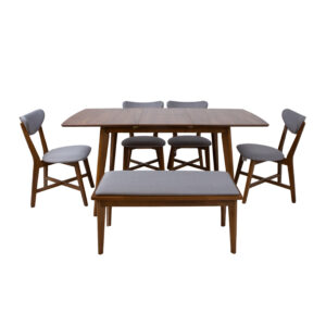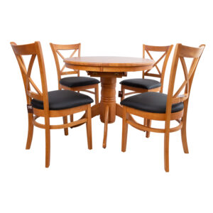 Valgomojo stalo komplektas CHICAGO NEW su 6 kėdėmis. Stalo matmenys 180x90xH76 cm. Stalo stalviršis: MDF su natūralaus ąžuolo lukštu. Stalo kojos (8×8 cm) ir rėmas pagaminti iš medžio masyvo ir padengti natūralaus ąžuolo lukštu. Stalo apdaila padengta medžio alyva. Kėdės matmenys 46x56xH103cm, sėdimosios dalies aukštis 47cm. Kėdės kojos ir karkasas pagaminti iš ąžuolo masyvo ir alyvuoti. Minkšta sėdynė aptraukta pilku poliesterio audiniu. Ribinis svoris 100 kg. Galima įsigyti 45×90 cm dydžio prailginimą, kodas 84026. Prailginimą galima pritvirtinti prie bet kurio stalo galo. PRIEŽIŪRA: natūraliu lukštu dengtas stalo stalviršis yra labai jautrus drėgmės pažeidimams ir temperatūrai. Stalas yra labai jautrus drėgmei ir drėgmei. Po stalu visada naudokite paklodes ir kaitlentes. Ant stalo išsiliejusį skystį reikia nedelsiant nuvalyti minkšta šluoste. Venkite pernelyg didelio šveitimo ir abrazyvinių valymo priemonių.
