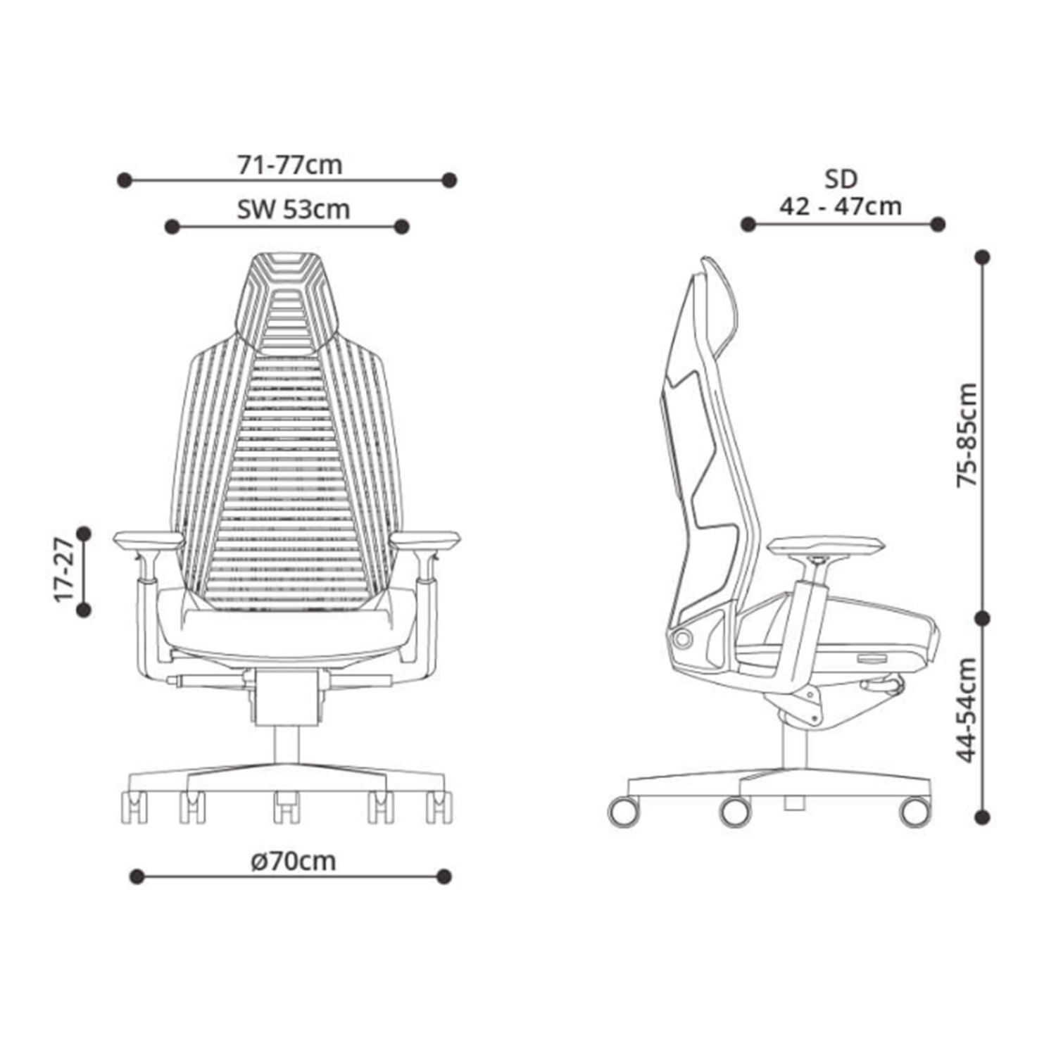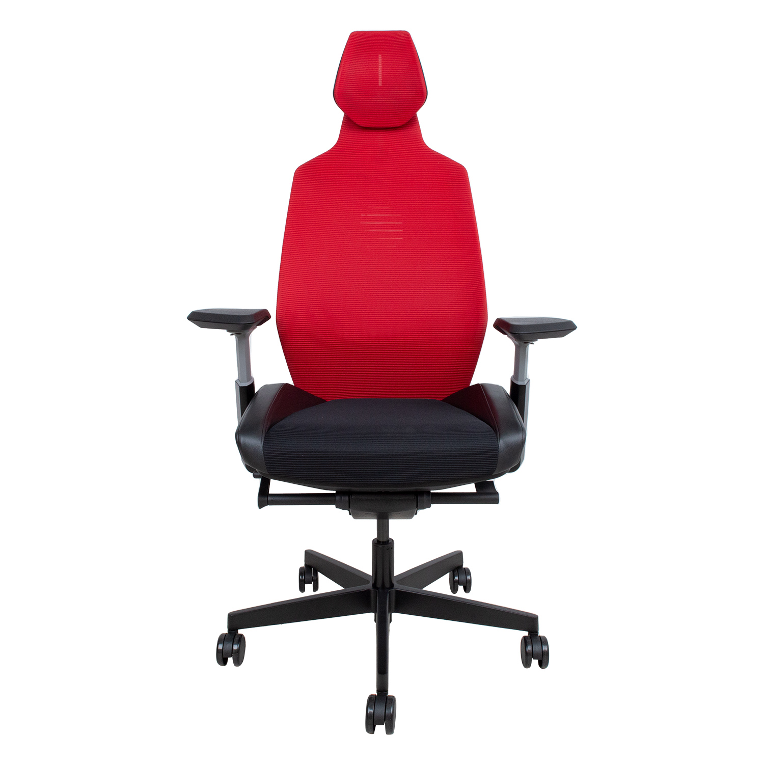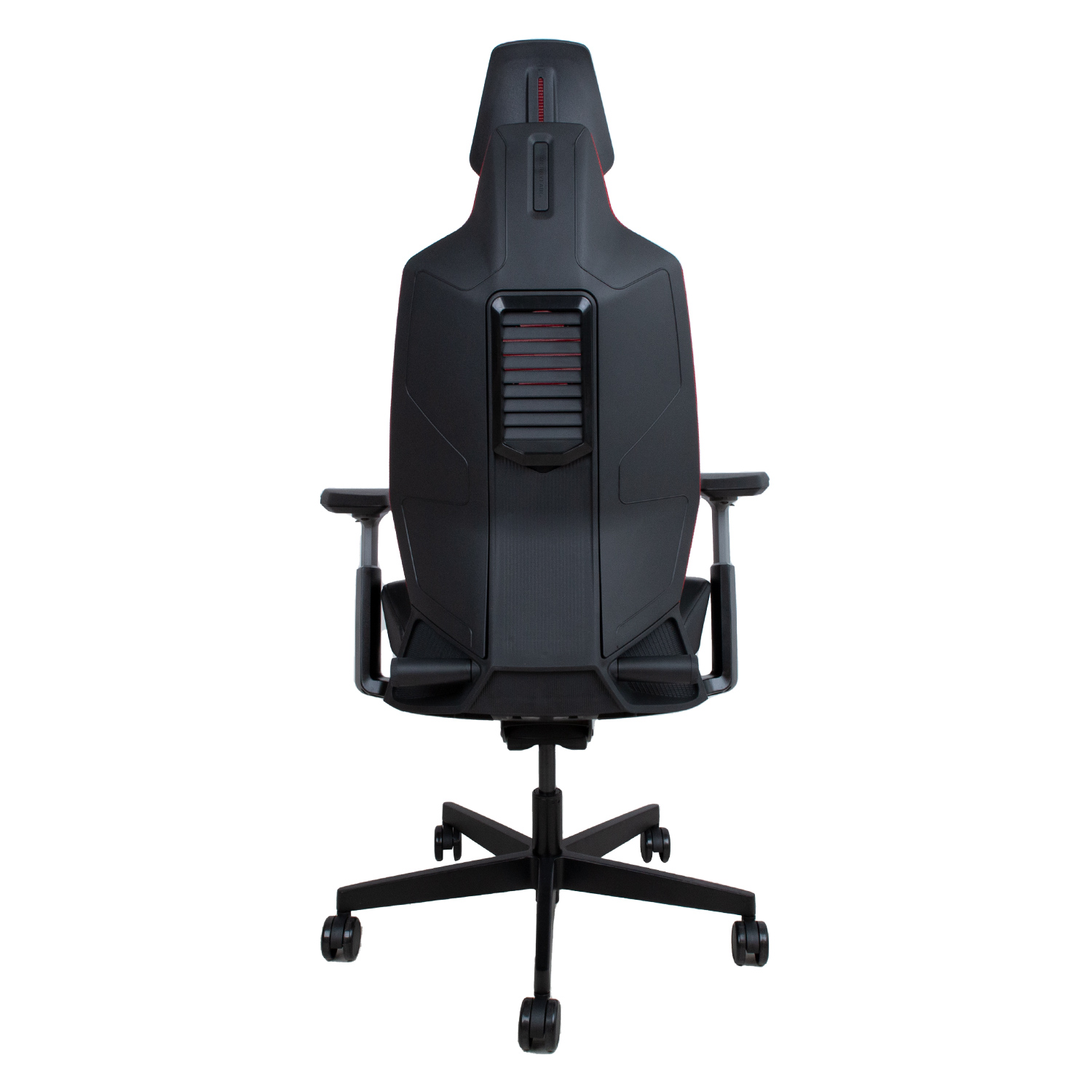 Žaidimų kėdė RONIN juoda/raudona. Norint laimėti žaidimą, reikia geriausios įrangos! Patogi ir funkcionali ši kėdė padeda susikaupti ir greitai reaguoti ilgas valandas. Išorinė kėdės nugarėlė išlieta iš juodo plastiko su ventiliacine anga viduryje. Atlošas aptrauktas daugiasluoksniu poliesterio tinkleliu, kad puikiai praleistų orą. Juosmens atrama reguliuojama už sėdynės esančia pasukama rankena. Reguliuojamas galvos atramos aukštis. Sėdynės pagalvėlė suformuota iš poliuretano putų ir aptraukta daugiasluoksniu poliesterio tinkleliu bei oda. Sėdynės gylis reguliuojamas 5 cm. Kėdės porankiai turi plokščių atraminį paviršių ir yra suformuoti iš tvirto putų poliuretano. Pluoštu sutvirtinti porankiai pagaminti iš pilko poliamido, o pagrindo rėmas – iš lieto aliuminio lydinio. Porankių aukštis reguliuojamas 10 cm, o plotis – 5 cm. Kėdė turi sinchroninį mechanizmą. Atlošo pasvirimą galima užfiksuoti 10 padėčių ir reguliuoti pasvirimą. Sėdynės aukštis reguliuojamas droseliais. Kėdės 5 ramsčių pagrindas pagamintas iš lieto aliuminio ir padengtas juodais epoksidiniais milteliniais dažais. Kėdė turi 65 mm šlifavimo tausojančius nailoninius ratukus. Bendrieji kėdės matmenys yra 71x70xH119-139 cm. Sėdynės plotis 53 cm, sėdynės gylis 42-47 cm, sėdynės aukštis 44-54 cm. Ribinis svoris 120 kg.